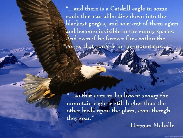 But even Solomon, he says, “the man that wandereth out of the way of understanding shall remain” (i.e. even while living) “in the congregation of the dead.” Give not thyself up, then, to fire, lest it invert thee, deaden thee; as for the time it did me. There is a wisdom that is woe; but there is a woe that is madness. And there is a Catskill eagle in some souls that can alike dive down into the blackest gorges, and soar out of them again and become invisible in the sunny spaces. And even if he for ever flies within the gorge, that gorge is in the mountains; so that even in his lowest swoop the mountain eagle is still higher than other birds upon the plain, even though they soar.