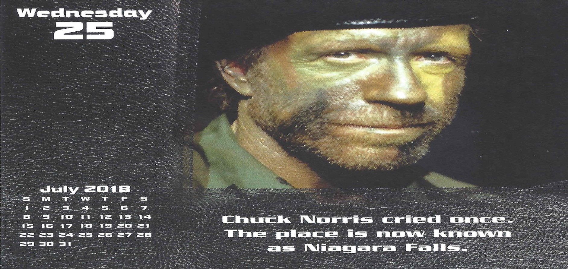 Turning my calendar this morning, one guaranteeing a Chuck Norris joke a day, I read, “Chuck Norris cried once. The place is now known as Niagara Falls.” I hadn’t the wits about me to realize the foreshadowing, and an hour later, we received word that a loved one had passed.