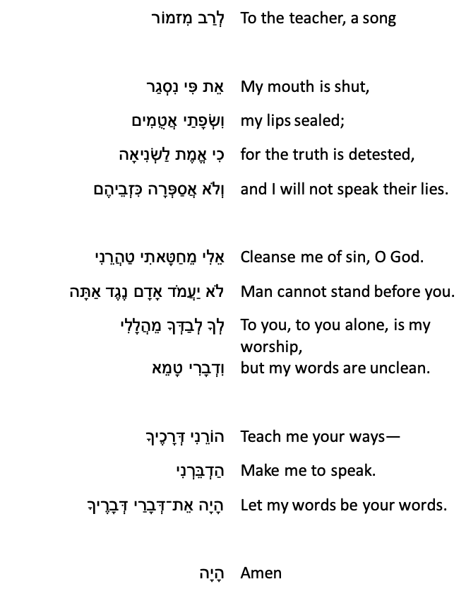 So, I’ve been studying Biblical Hebrew for two years now, and I’ve been taking a class on Hebrew composition. This is my first attempt at writing an original piece in Biblical Hebrew. I just finished it up, so I haven’t gotten any word back on how well I actually did on it. As such, it may be totally wrong, and I doubt it is without error. So, consider this a rough draft. Also, due to me not knowing how to properly deal with Hebrew characters in WordPress, I’m posting the psalm as a picture.