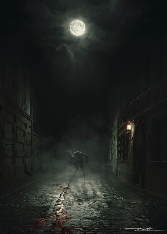 When the clouds parted, and the moonlight streamed down upon the square, I saw the stalking shadows. There was something in the faces of the monsters…Joel, the shopkeeper, those were his eyes, and Martha, that sweet and quiet girl, that was her smile with the canine teeth. A low growling filled the air, and on instinct, I pressed near my compatriot, the half-blind priest, and felt his sharp frame against my back.