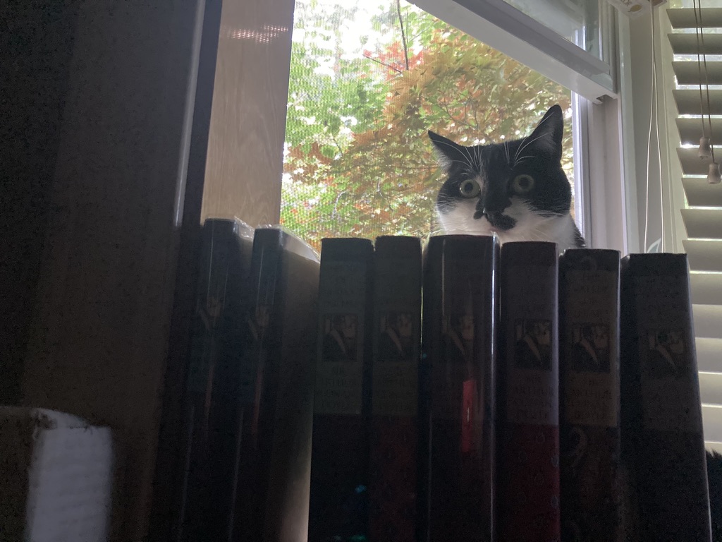 That being said, she was rubbing my leg and I was, now and again, reaching down to scratch her head or back. Then, misjudging the precise angle of reentry, her next pass overshot my calf and she bonked her head against one of the protruding levers which helps me adjust my chair.