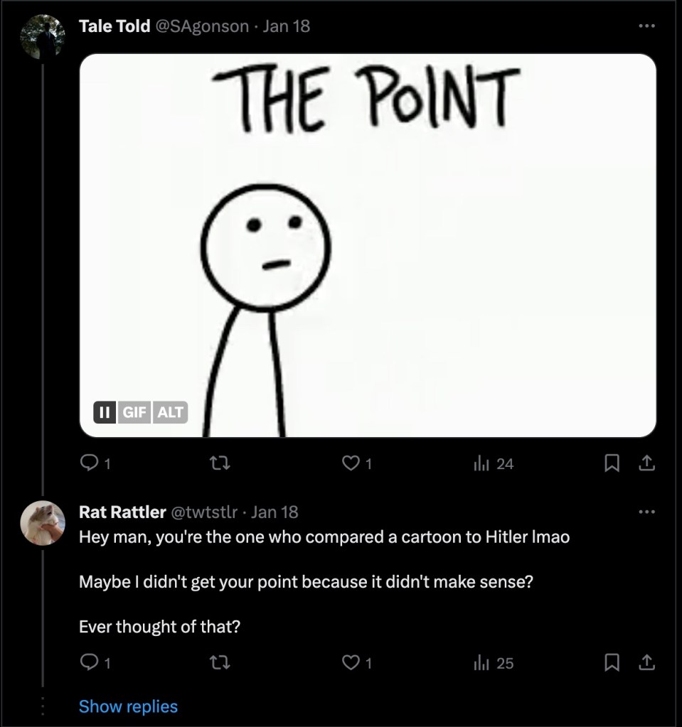 And so, I have some real sympathy when just such a mental invalid wrote “Maybe I didn’t get your point because it didn’t make sense?” I’m glad I stayed my original tweet which would have inquired into what language he’d prefer us to communicate in with the addendum that I would attempt to obtain an interpreter. The temptation to simply provide him a link to some free English language course came upon the heels of what I’d assumed was a precipitate response by someone who’d found the toil of reading a tweet an all too cumbersome and time-consuming obstacle in responding to it.