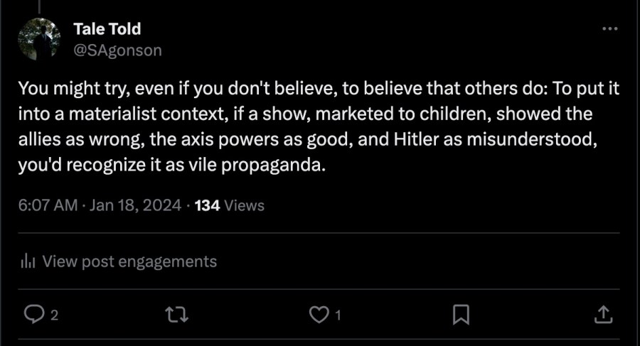 Which brings us back to the beginning, the middle, and really the whole of my little diatribe. An actual troll could not have written something so earnestly banal. An S-poster could not have invented a more jarring response. A poor, retar…er, special needs child could not have said something so confused.
